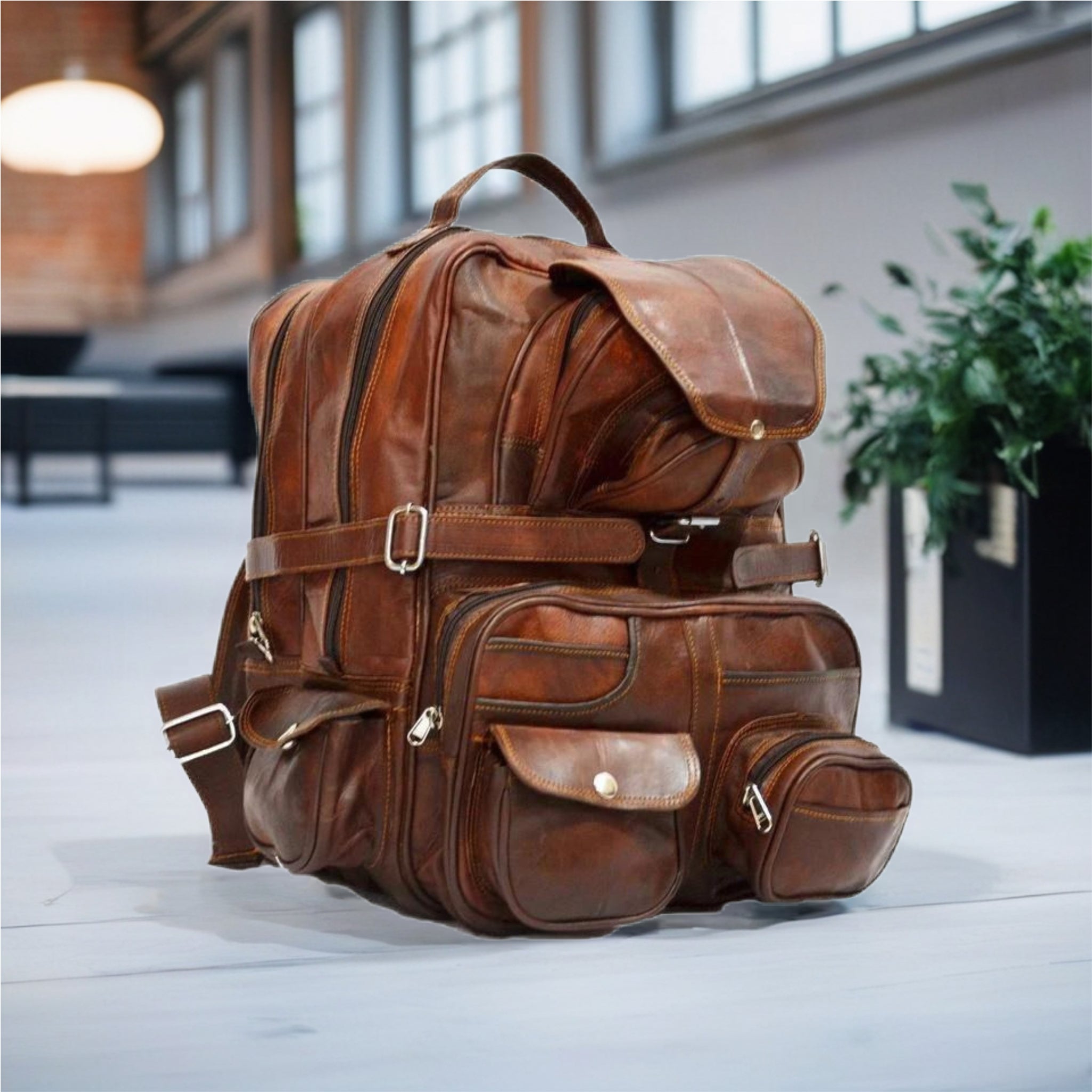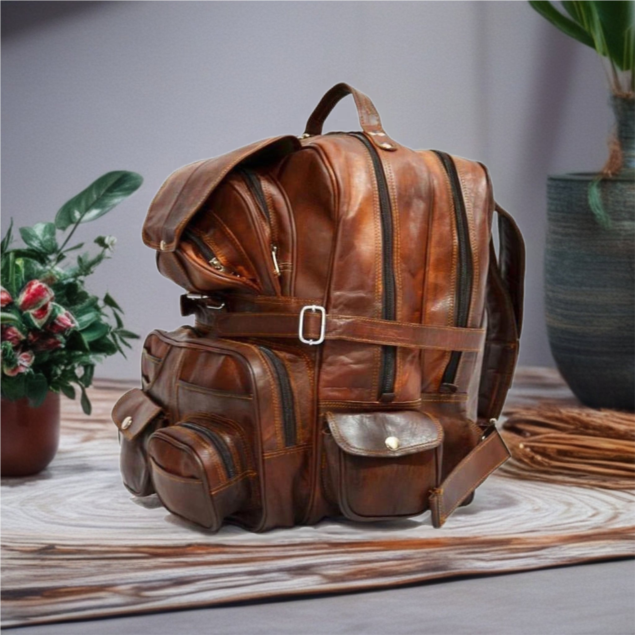 “Forged for exploration. Worn with grit. The Vintage Leather Travel Rucksack carries your adventures with untamed style.”
